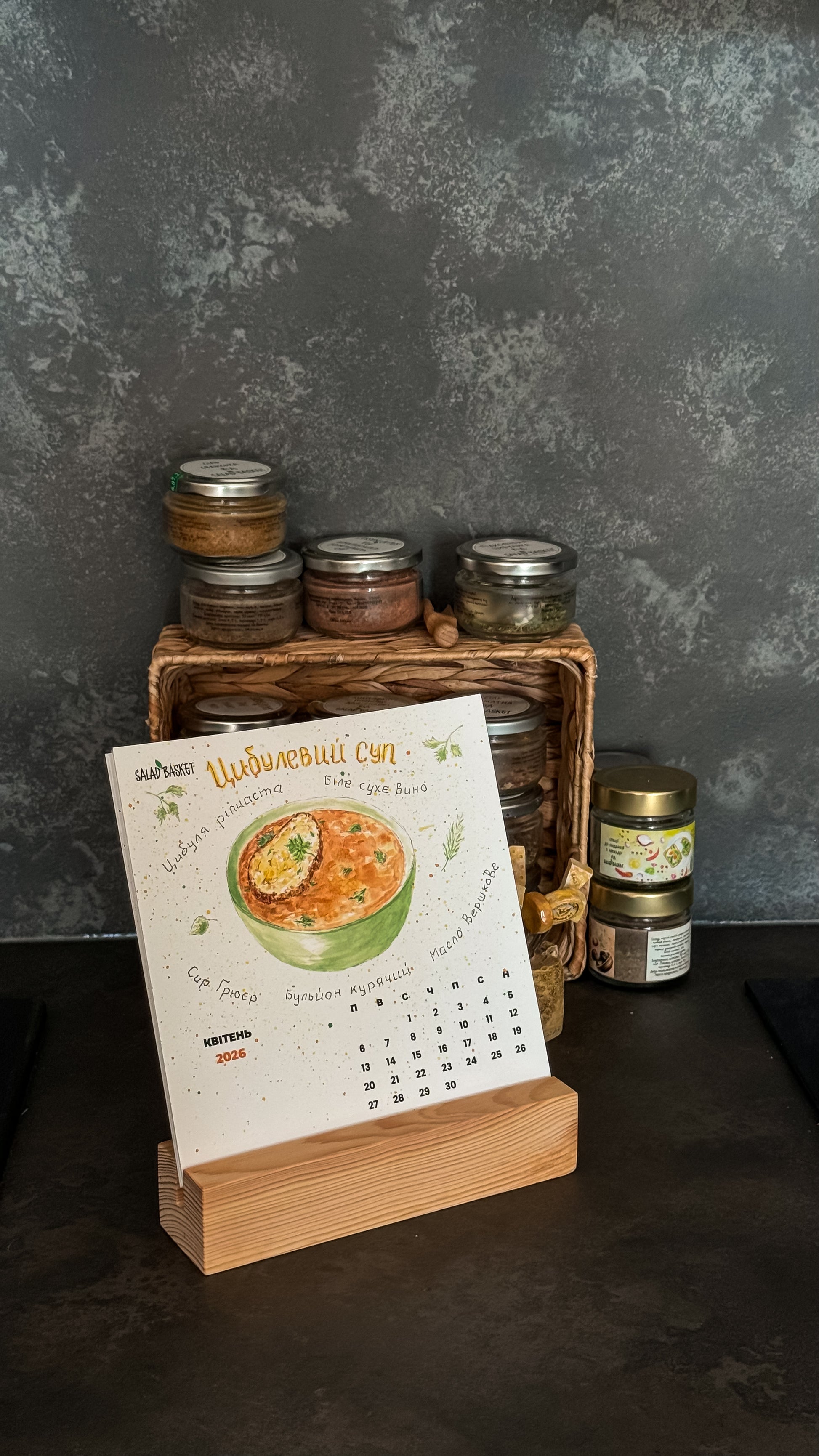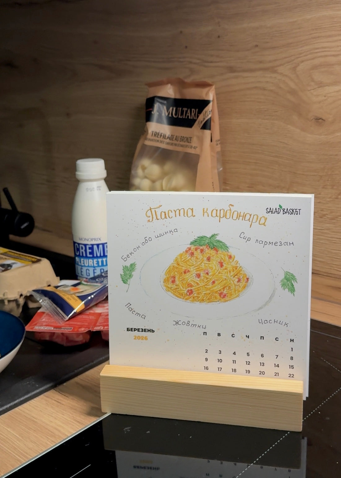 Кожен календар має дерев'яну підставку із сосни, упакований у бавовняний мішечок і чудово виглядає на кухні, як теплий акцент та щоденне натхнення 🍝