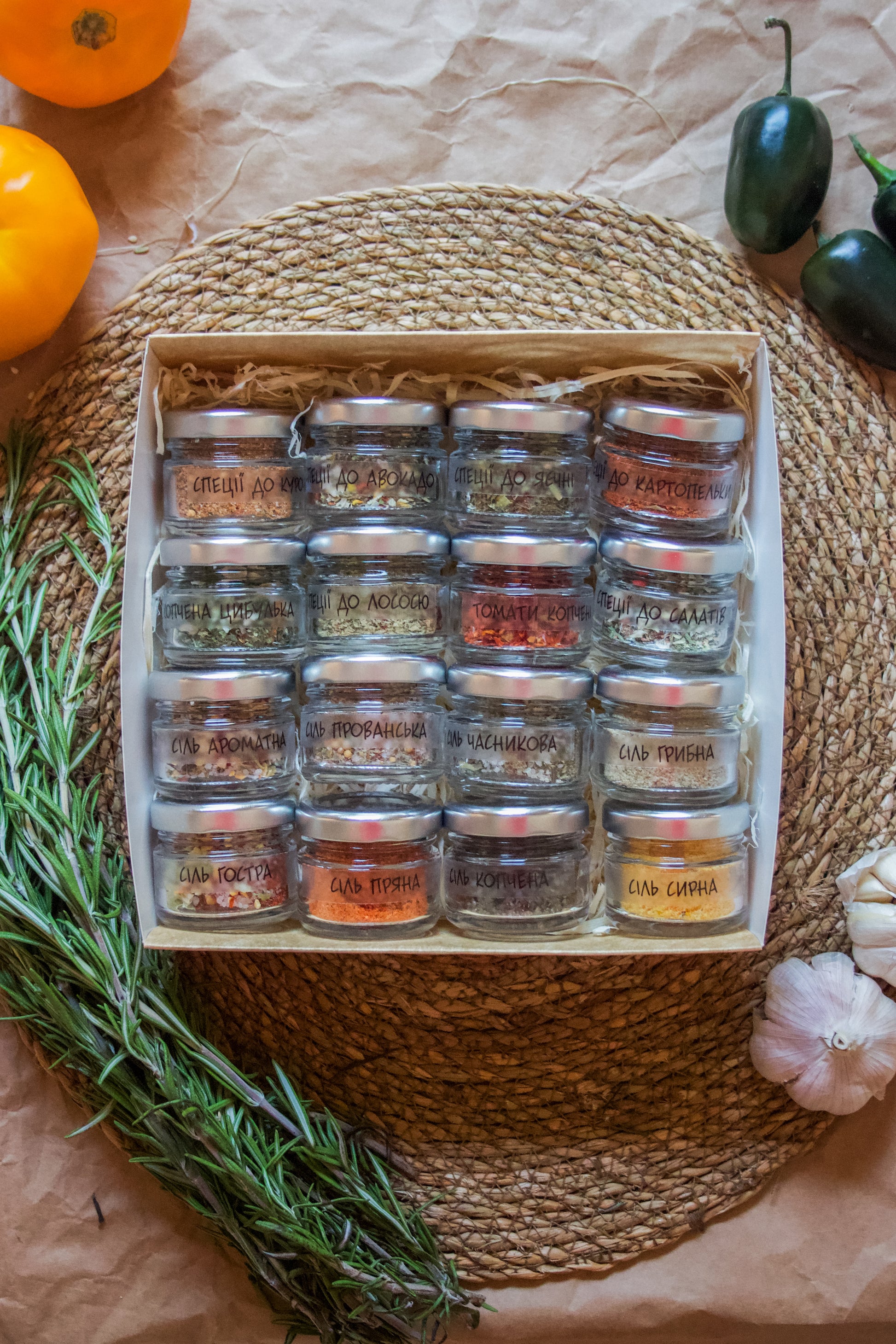Набір включає 16 баночок по 30 мл: спеції до сніданків з авокадо, спеції до сніданків з червоною рибкою, спеції для хрусткої курочки, підкопчена цибулька, спеції до картопельки, салатні прянощі, спеції до яєчні, томати копчені, сіль ароматна, сіль часникова, сіль гостра, сіль пряна, сіль копчена, сіль прованська, сіль грибна та сіль сирна.